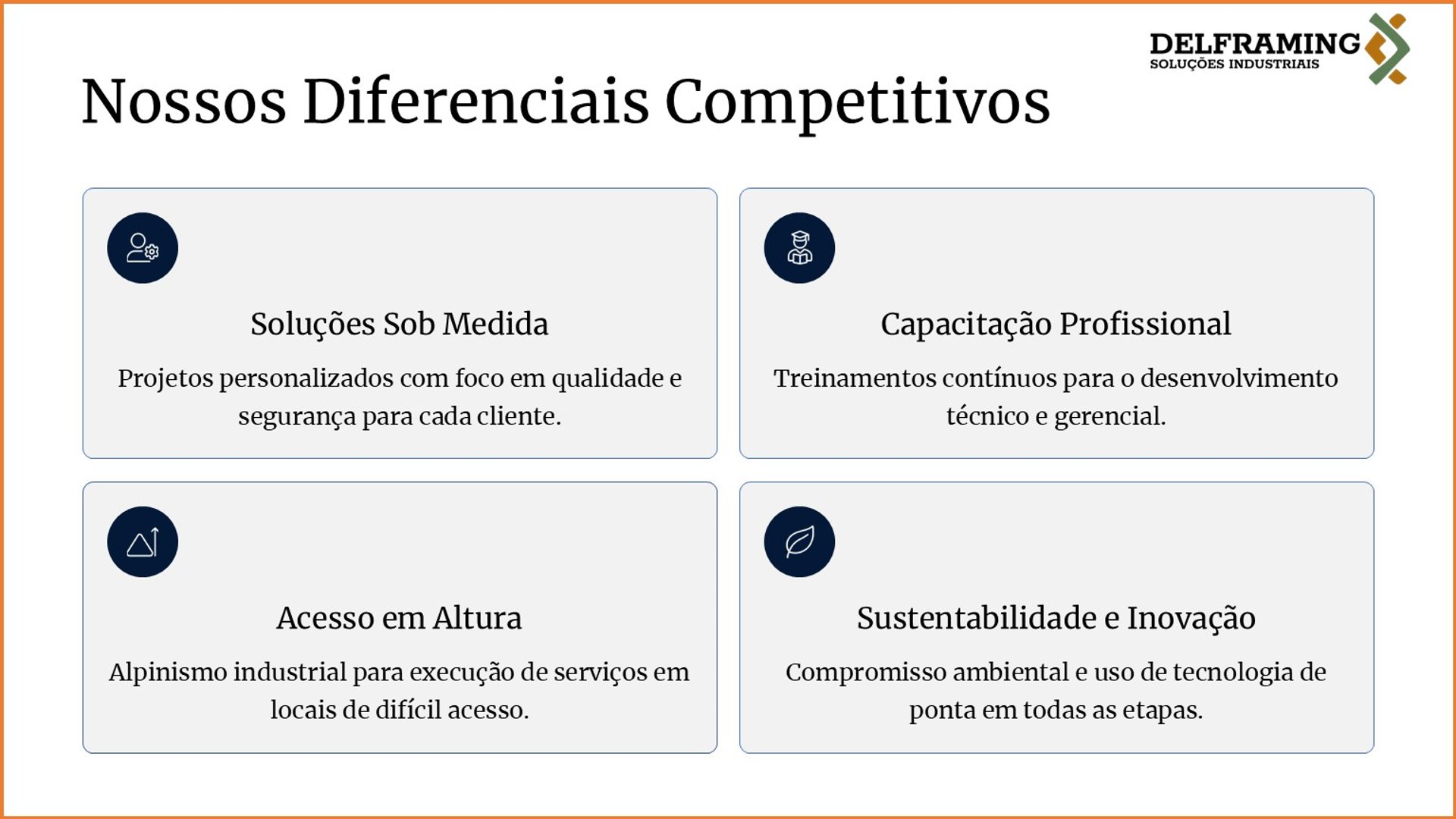 Se você busca por um parceiro confiável que se preocupe genuinamente com o sucesso da sua operação industrial, a Delframing é a escolha certa. Estamos prontos para enfrentar os desafios de hoje e as incertezas de amanhã, sempre com a missão de melhorar a sua planta industrial, fazendo dela um espaço mais seguro e produtivo.