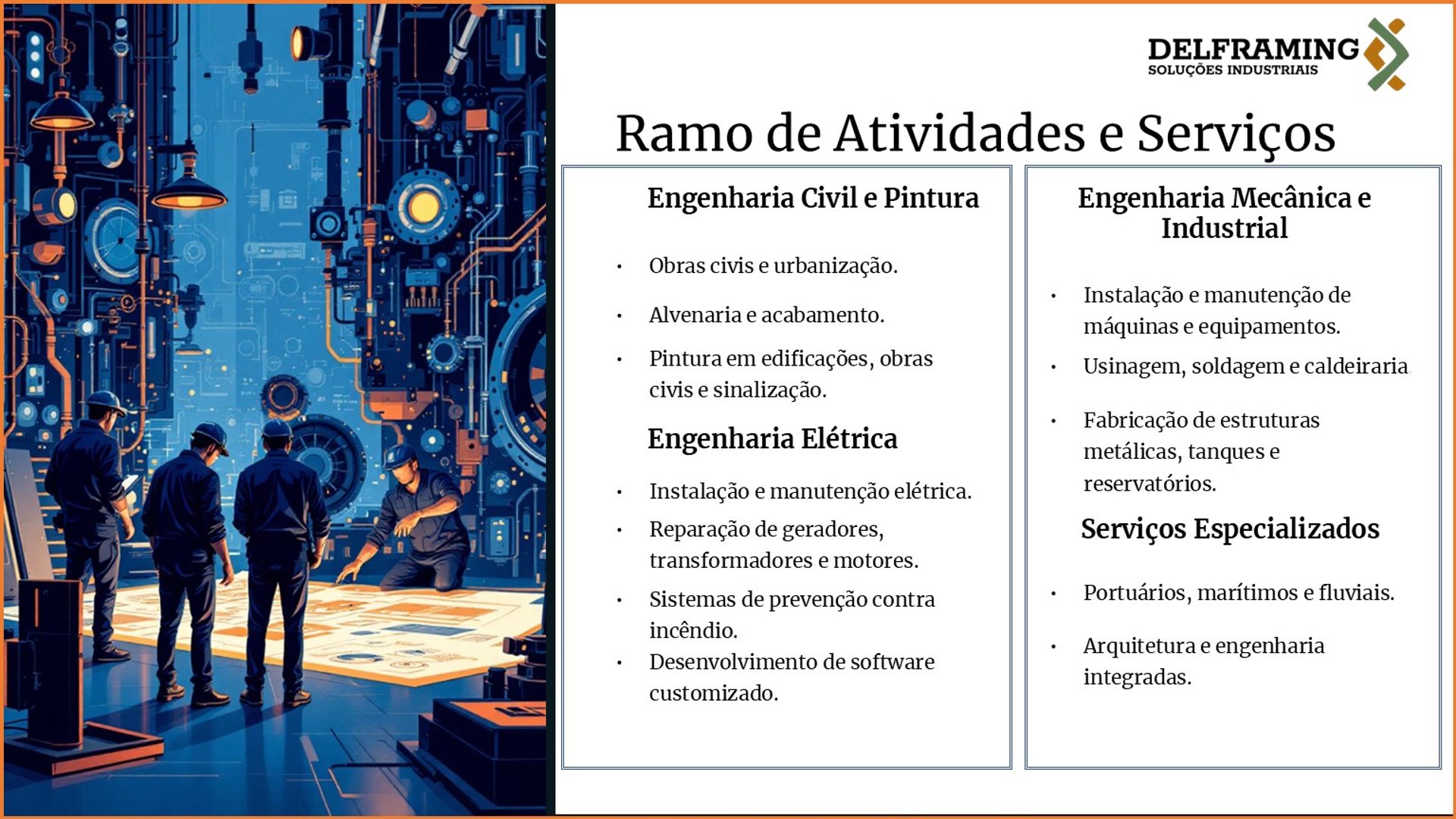 Na Delframing, entendemos que cada projeto é único, e trabalhamos em estreita colaboração com nossos clientes para desenvolver soluções personalizadas que atendam suas demandas específicas. Seja na montagem de novas instalações industriais ou na manutenção de sistemas existentes, nossa equipe se dedica a oferecer o melhor serviço, garantindo a satisfação e a prosperidade de nossos parceiros.