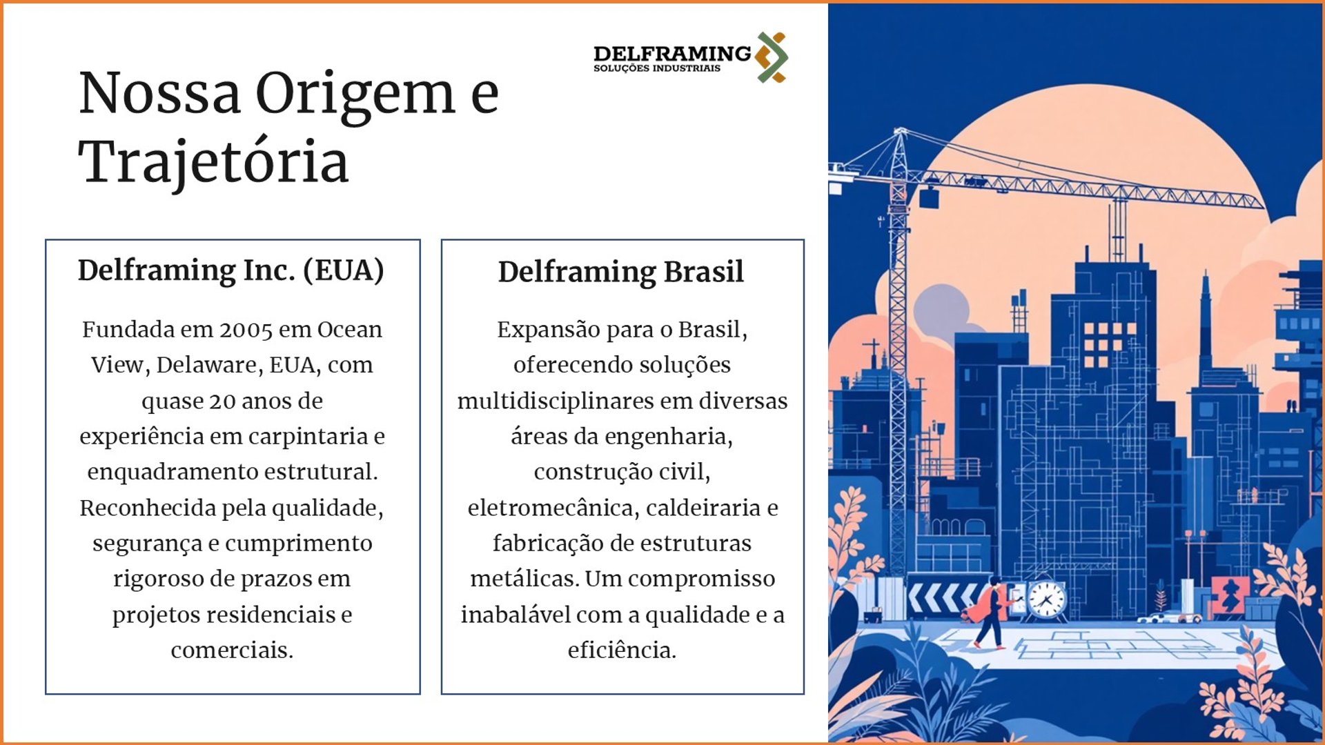 A Delframing, presente há 20 anos nos Estados Unidos, é uma empresa que se destaca pela inovação e excelência em montagem e manutenção industrial. Nossa especialização abrange soluções multidisciplinares em diversas áreas da engenharia, com um compromisso inabalável com a qualidade e a eficiência.